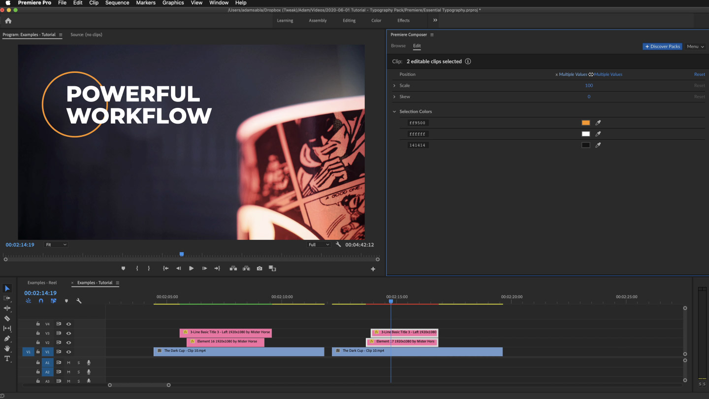 Watch VideoThis is a pack of animated typography for Premiere Pro and After Effects. It works with both of our free plugins Premiere Composer and Animation Composer.